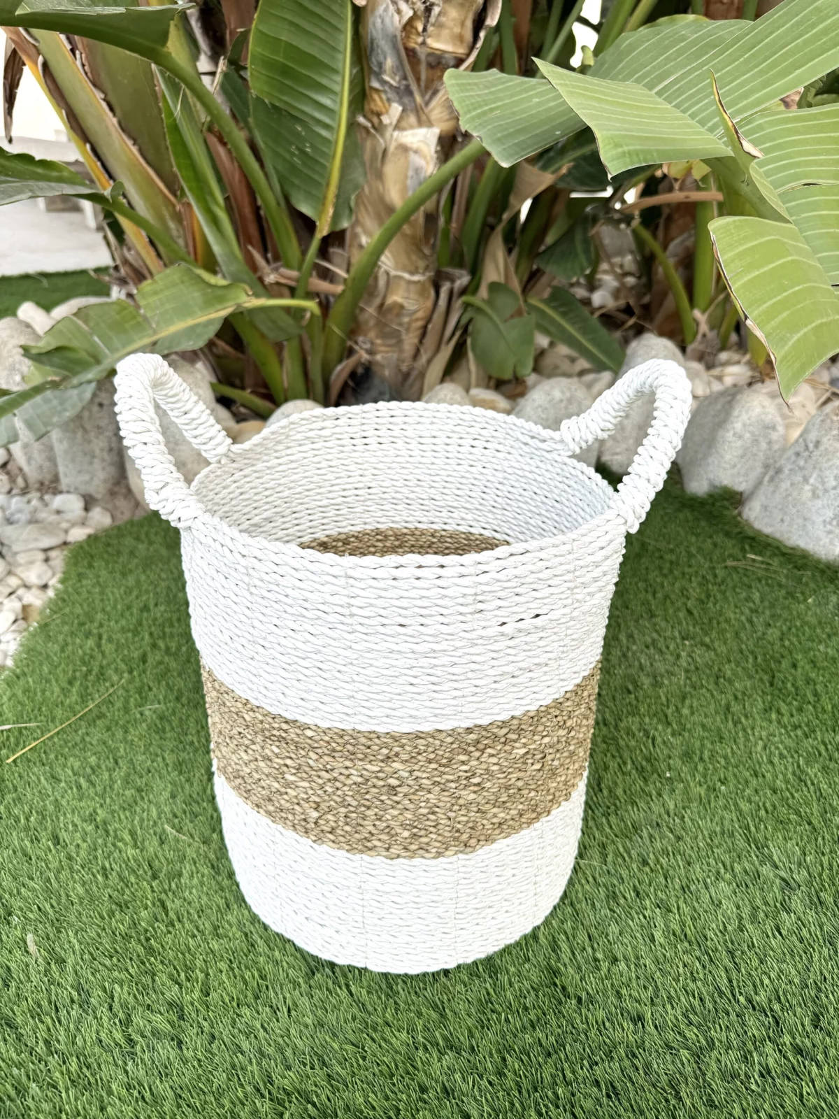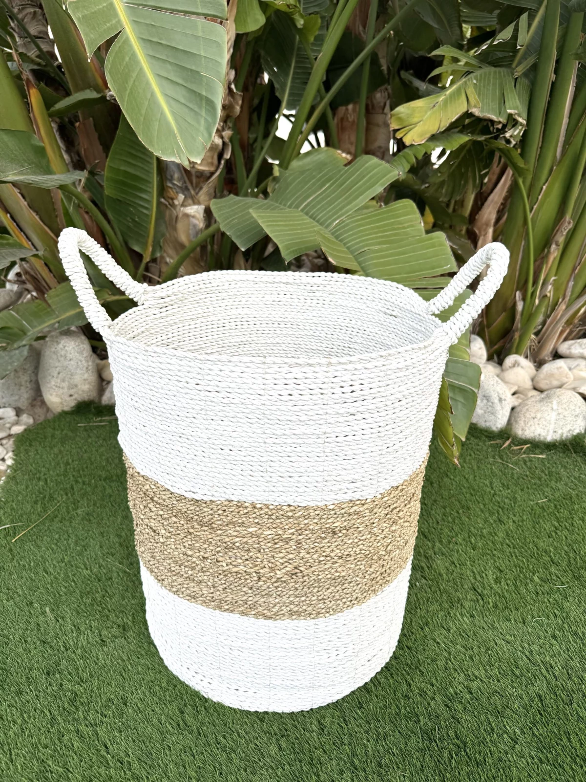 Elaborado a mano con fibras naturales, presenta dos tonalidades y texturas distintas que le otorgan un encantador aspecto rústico y natural, evocando la tradición de las cestas de mimbre o ratán, ahora más populares que nunca. Estos cestos son sostenibles al ser artesanales y confeccionados a mano con materiales naturales.