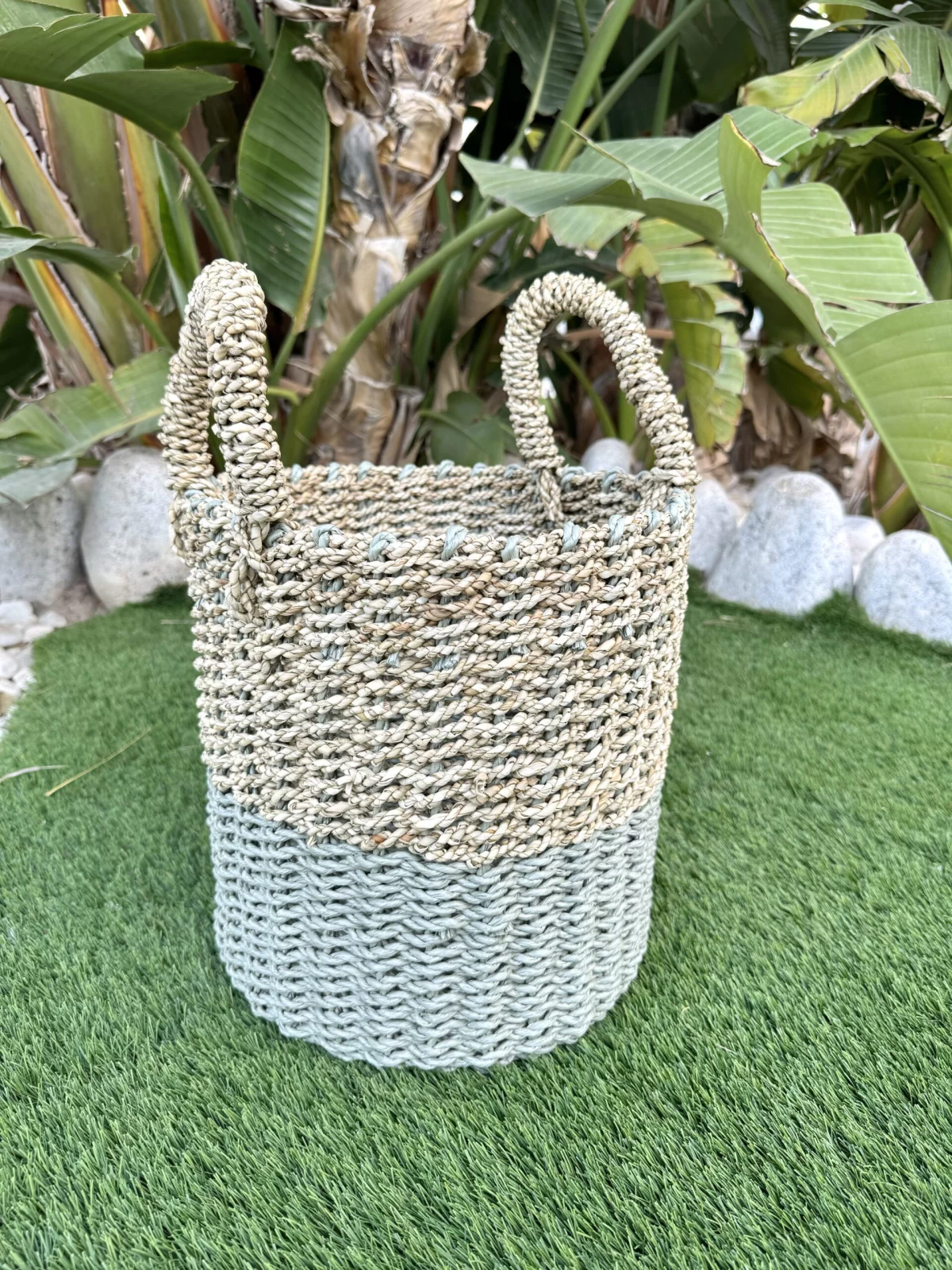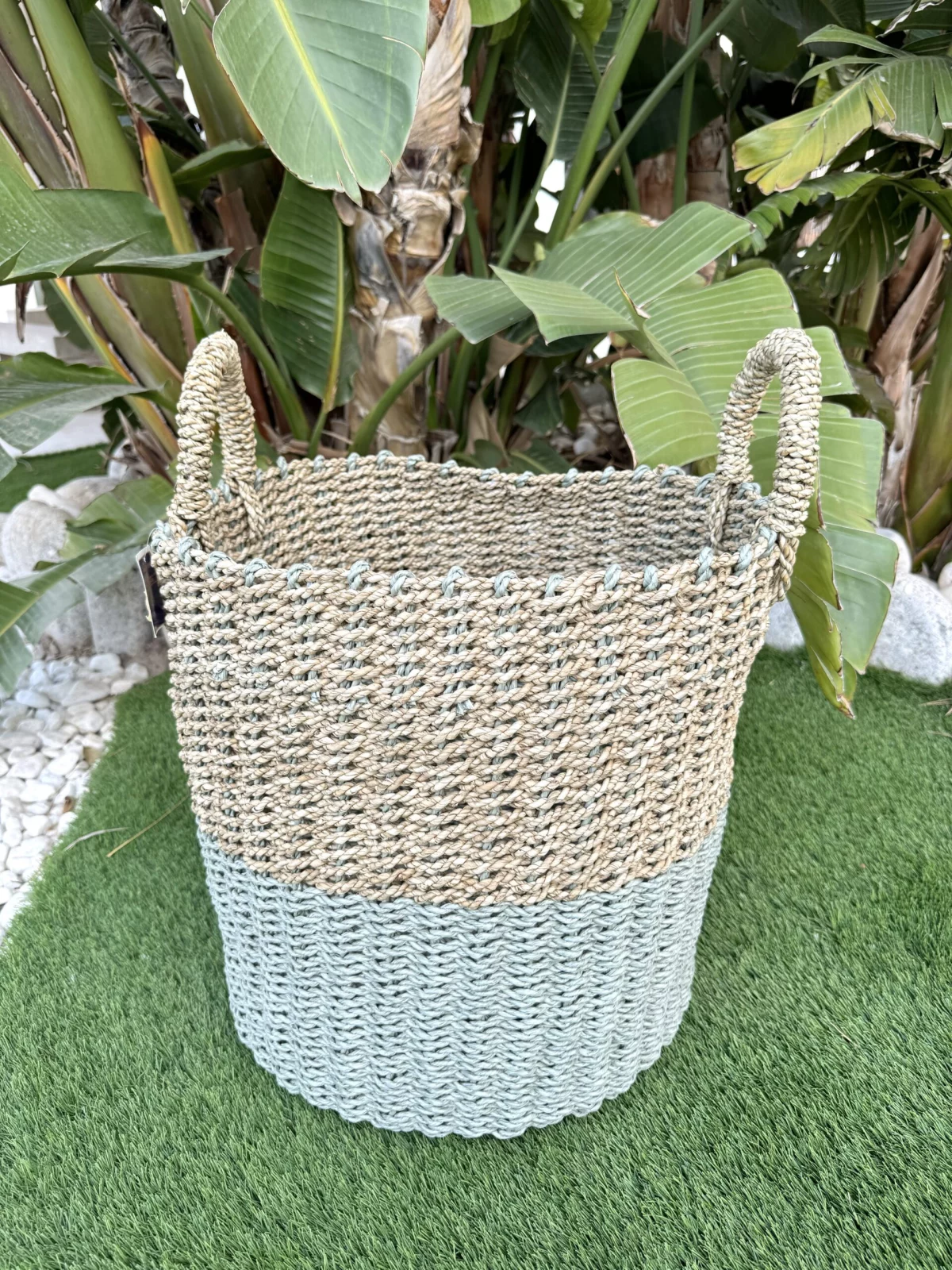 Elaborado a mano con fibras naturales, presenta dos tonalidades y texturas distintas que le otorgan un encantador aspecto rústico y natural, evocando la tradición de las cestas de mimbre o ratán, ahora más populares que nunca. Estos cestos son sostenibles al ser artesanales y confeccionados a mano con materiales naturales.