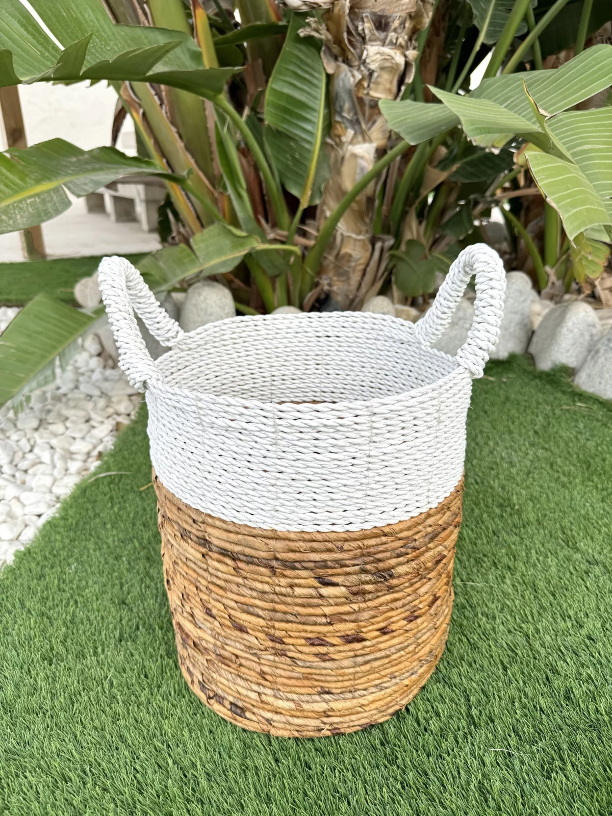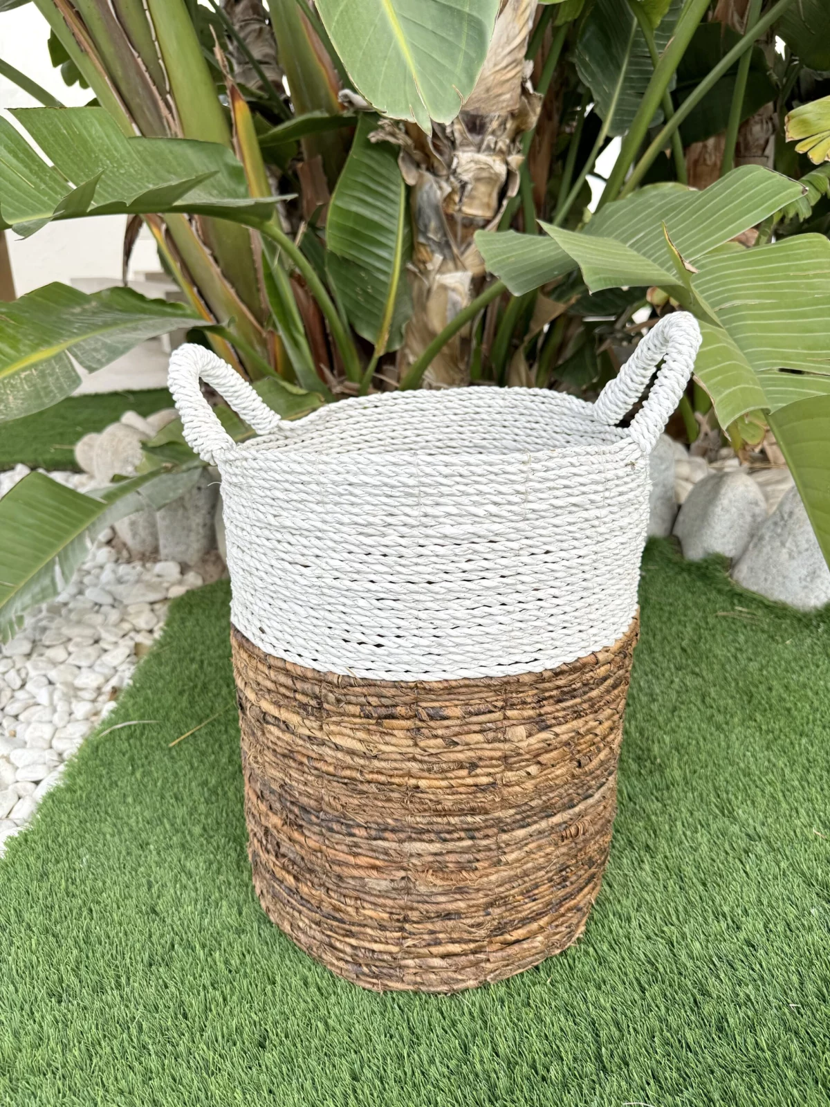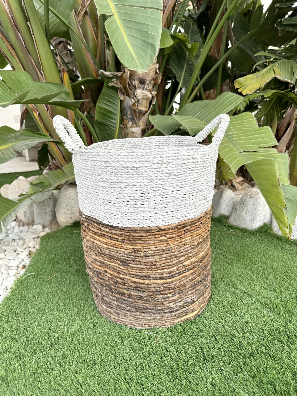 Elaborado a mano con fibras naturales, presenta dos tonalidades y texturas distintas que le otorgan un encantador aspecto rústico y natural, evocando la tradición de las cestas de mimbre o ratán, ahora más populares que nunca. Estos cestos son sostenibles al ser artesanales y confeccionados a mano con materiales naturales.