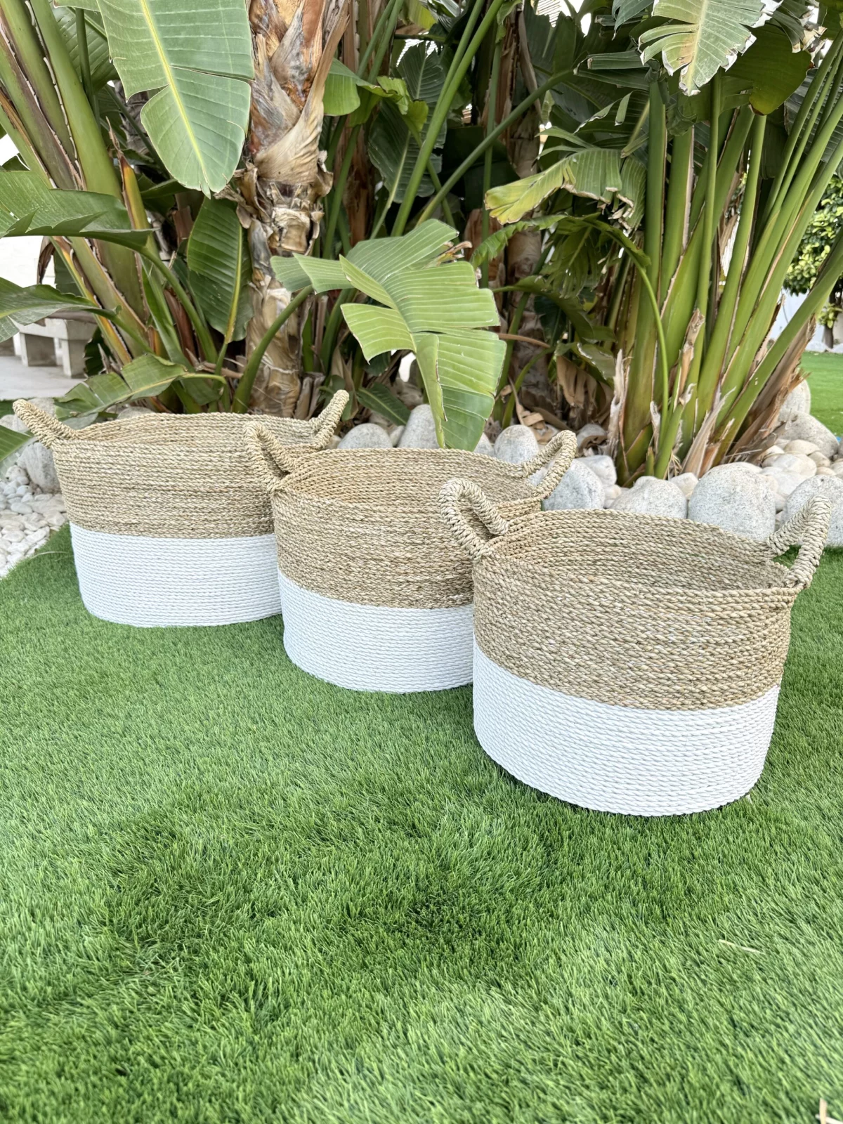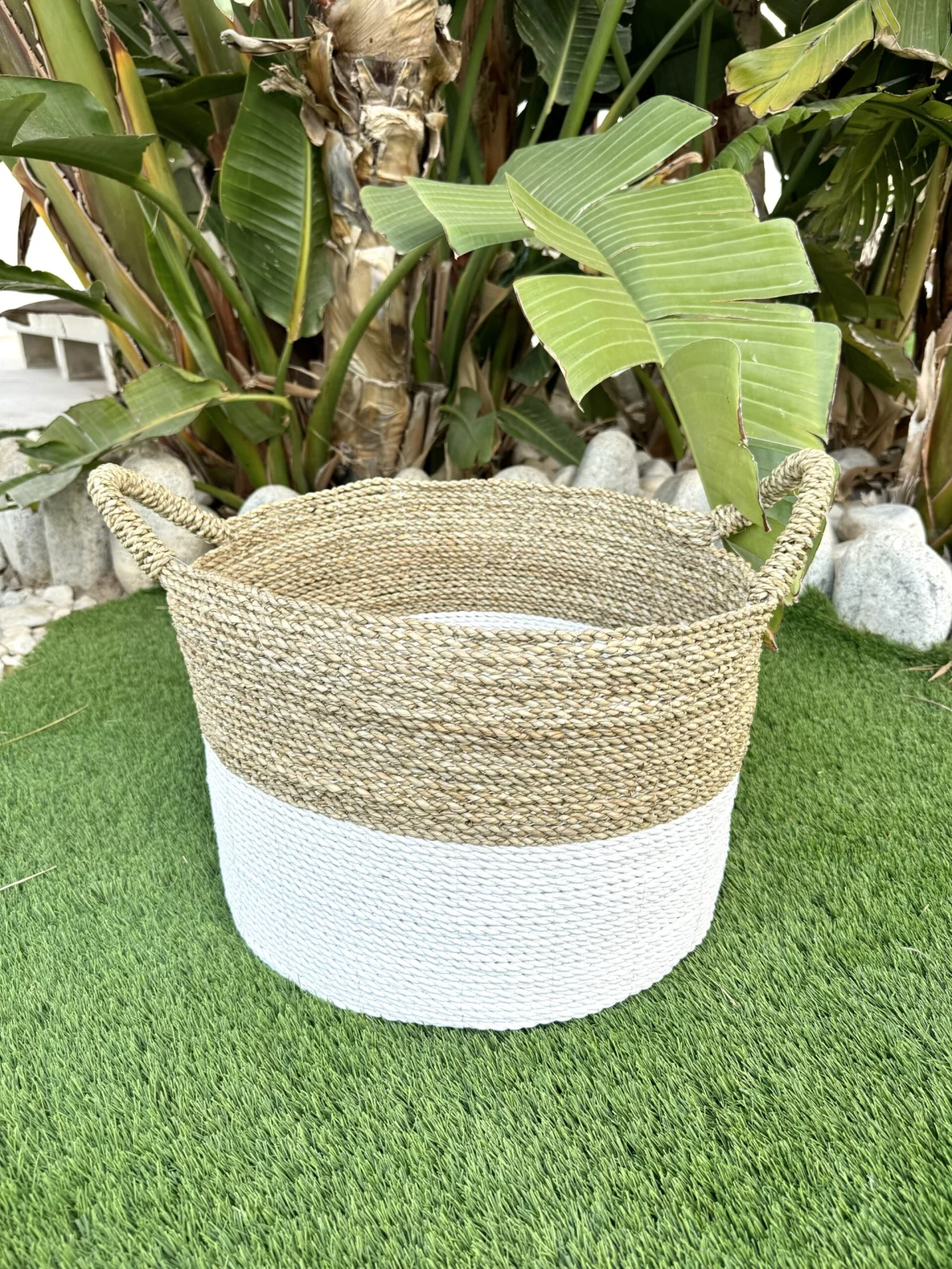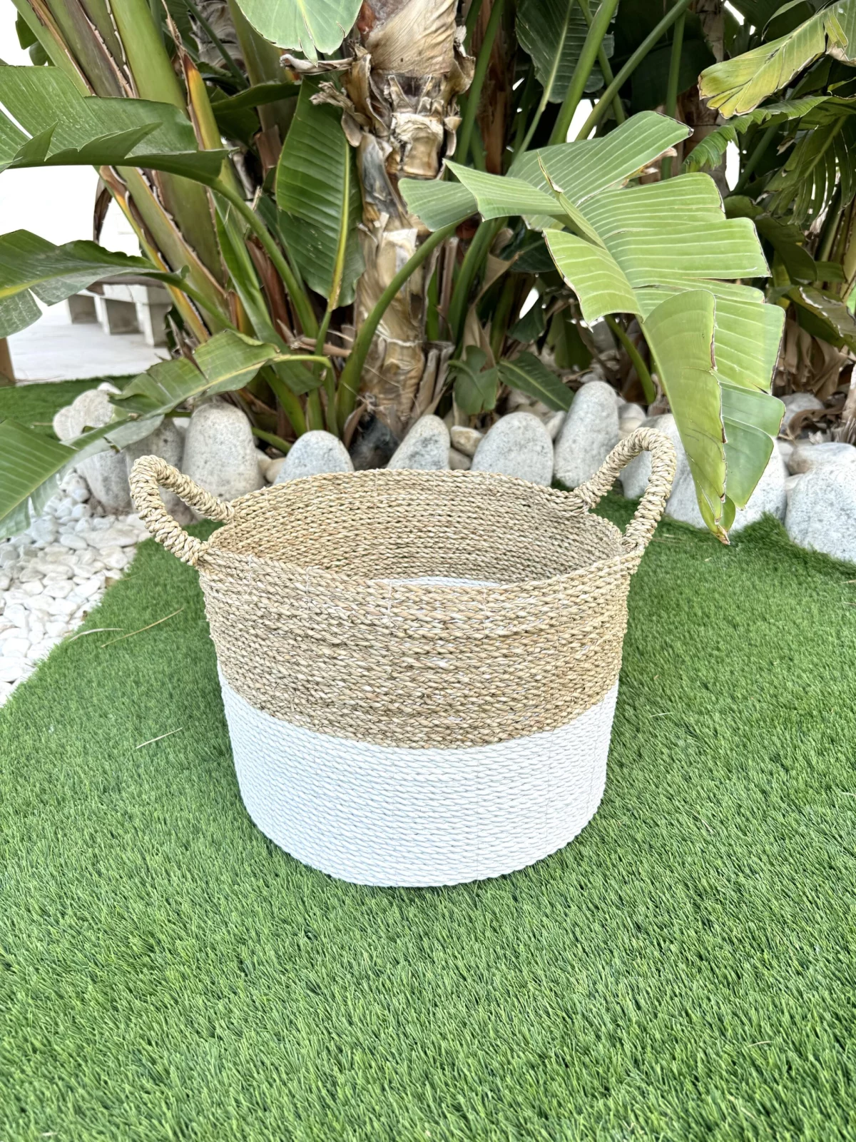 Elaborado a mano con fibras naturales, presenta dos tonalidades y texturas distintas que le otorgan un encantador aspecto rústico y natural, evocando la tradición de las cestas de mimbre o ratán, ahora más populares que nunca. Estos cestos son sostenibles al ser artesanales y confeccionados a mano con materiales naturales.