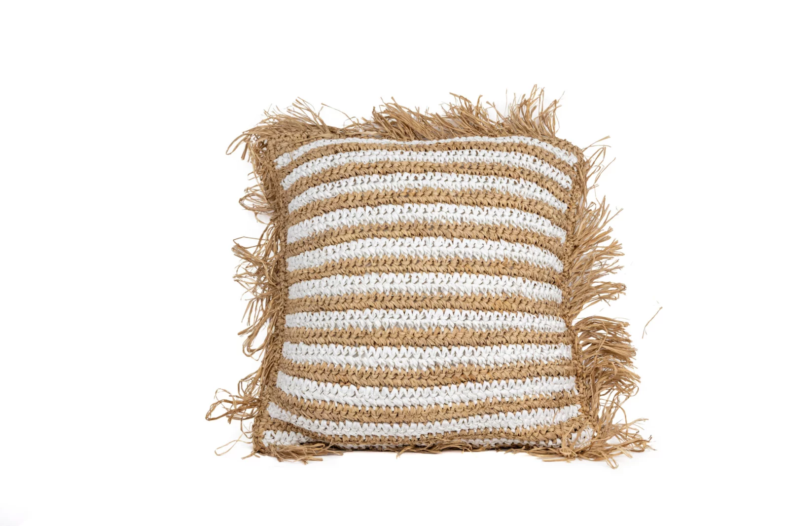 Este cojín decorativo tejido a mano es una pieza estrella para dar un aire fresco y artesanal a cualquier espacio. Su diseño se compone de franjas horizontales alternadas en blanco y tono natural, elaboradas con fibras vegetales entrelazadas cuidadosamente para lograr una textura rica y envolvente. El borde está adornado con flecos sueltos del mismo material natural, que aportan movimiento, volumen y un toque bohemio sin esfuerzo.