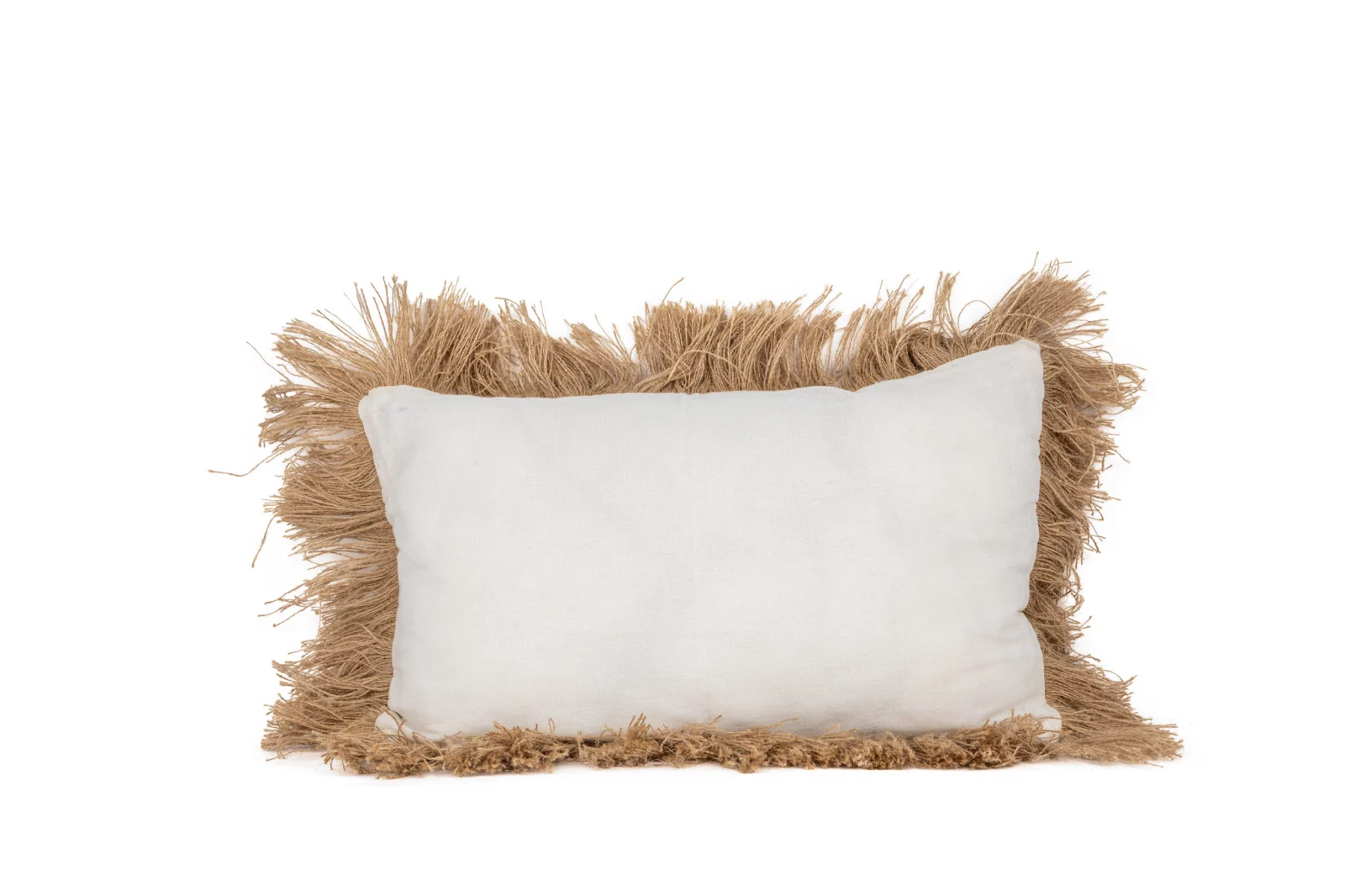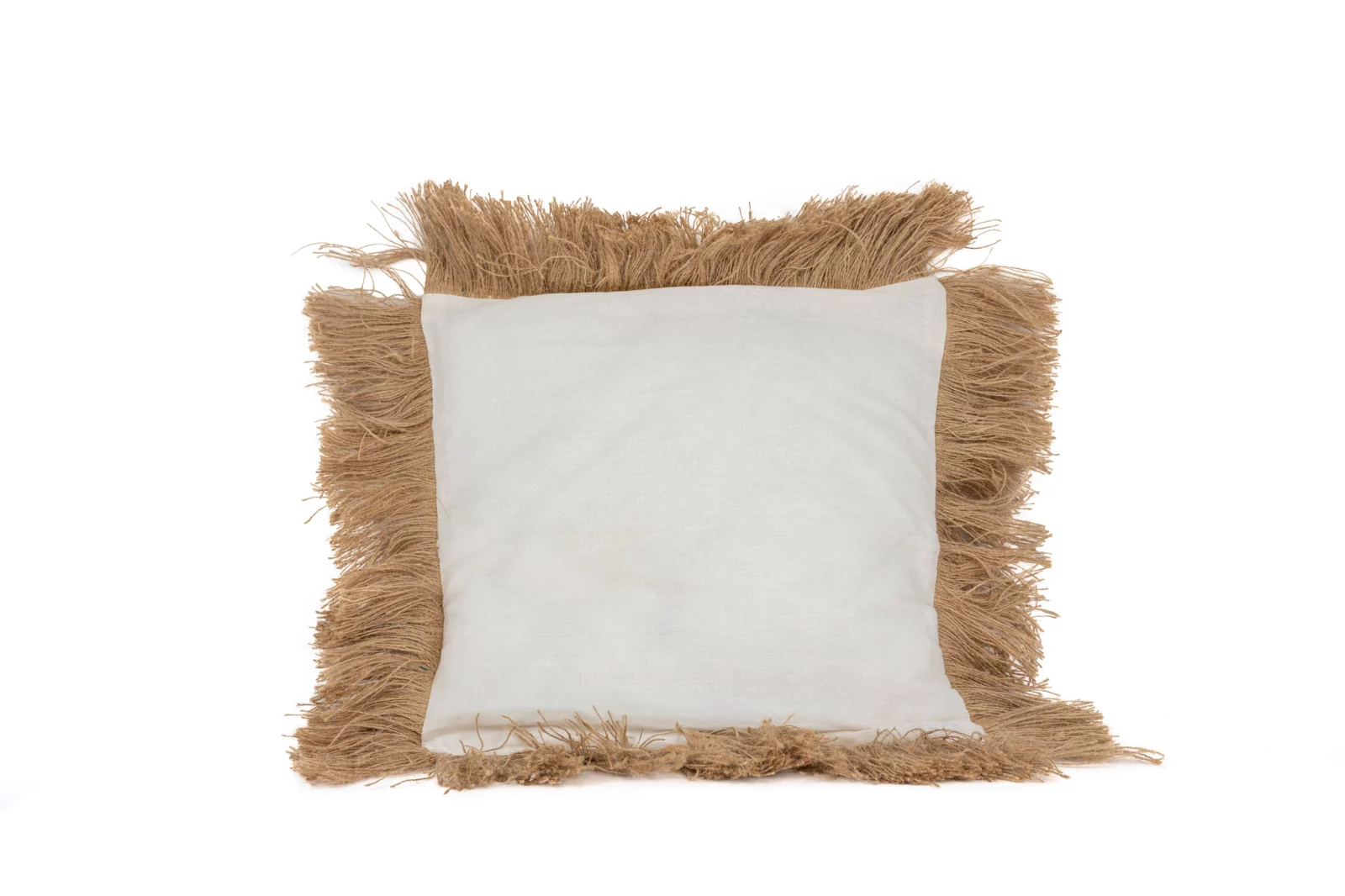 En cada una de sus esquinas se encuentran borlas de hilo natural que añaden un detalle lúdico y artesanal, dándole un toque único que lo hace perfecto para sofás, sillones, rincones de lectura o incluso dormitorios de estilo étnico o mediterráneo. Este cojín no solo decora, sino que también aporta confort y carácter, integrándose con facilidad en ambientes cálidos, neutros o con inspiración terracota.