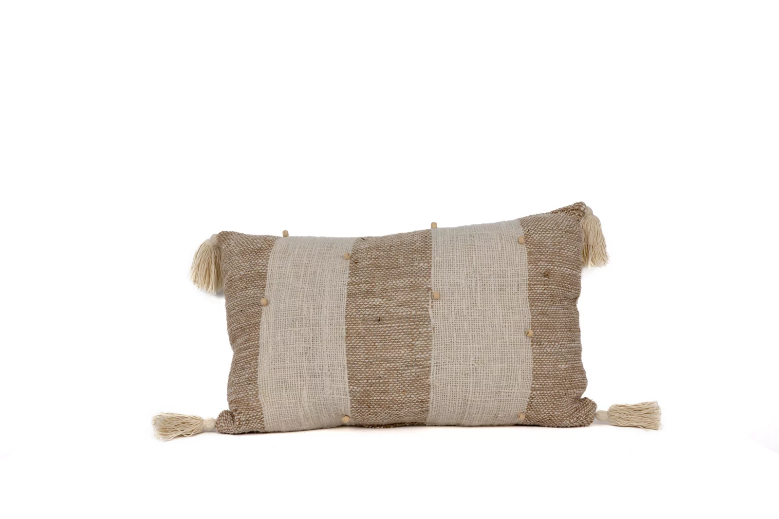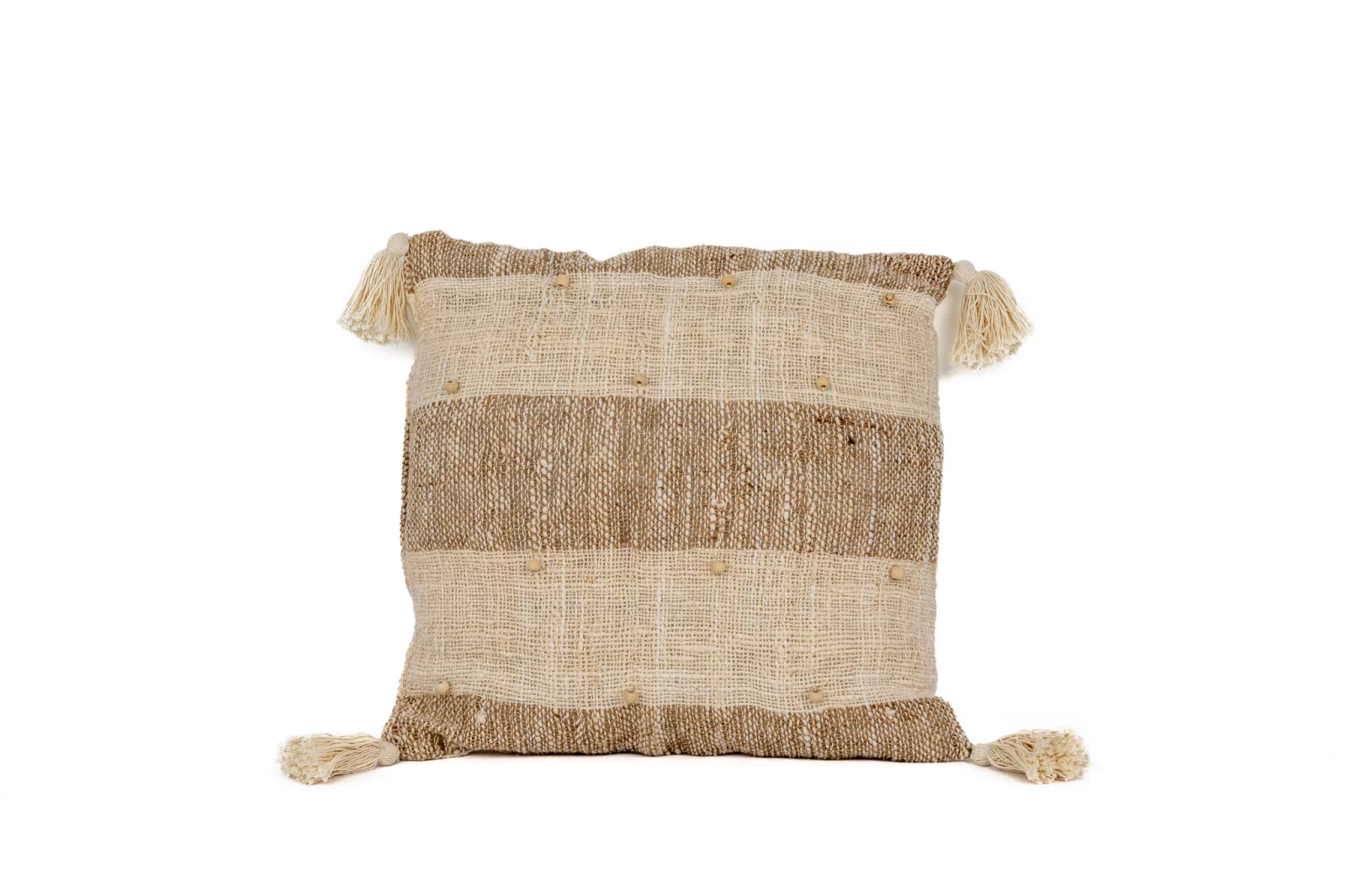 Cojines artesanales con franjas de fibra natural, cuentas de madera cosidas y borlas decorativas. Estilo rústico-bohemio perfecto para crear espacios cálidos y con personalidad.