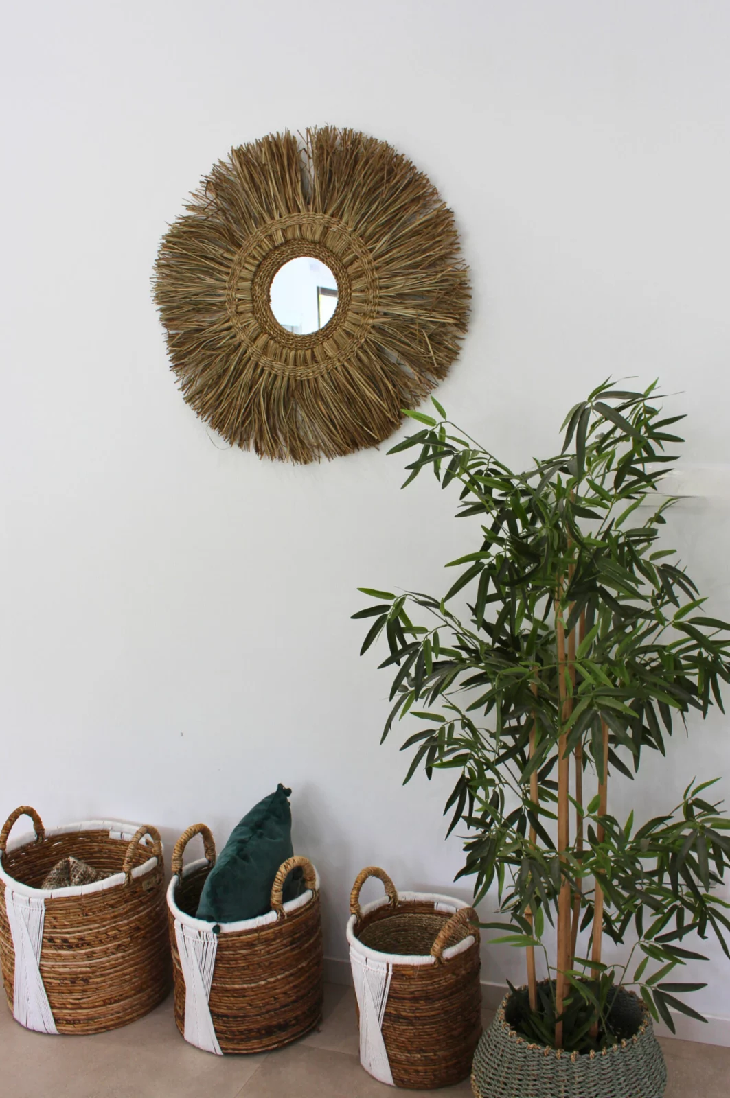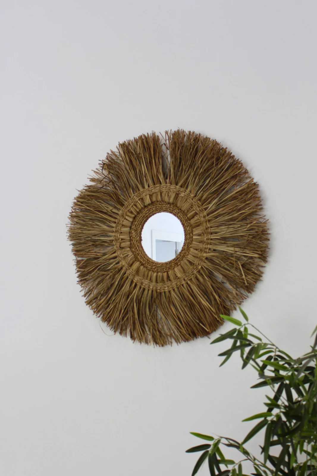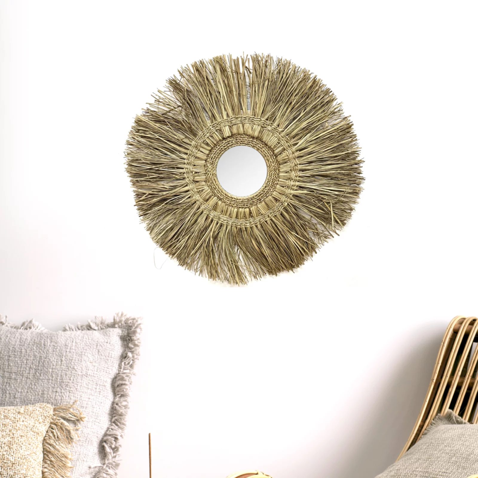 El Espejo de Pared Redondo en Rafia Rinca es un accesorio perfecto para quienes prefieren el estilo natural. Su diseño presenta una forma circular con un marco hecho de rafia natural, un material resistente y flexible.