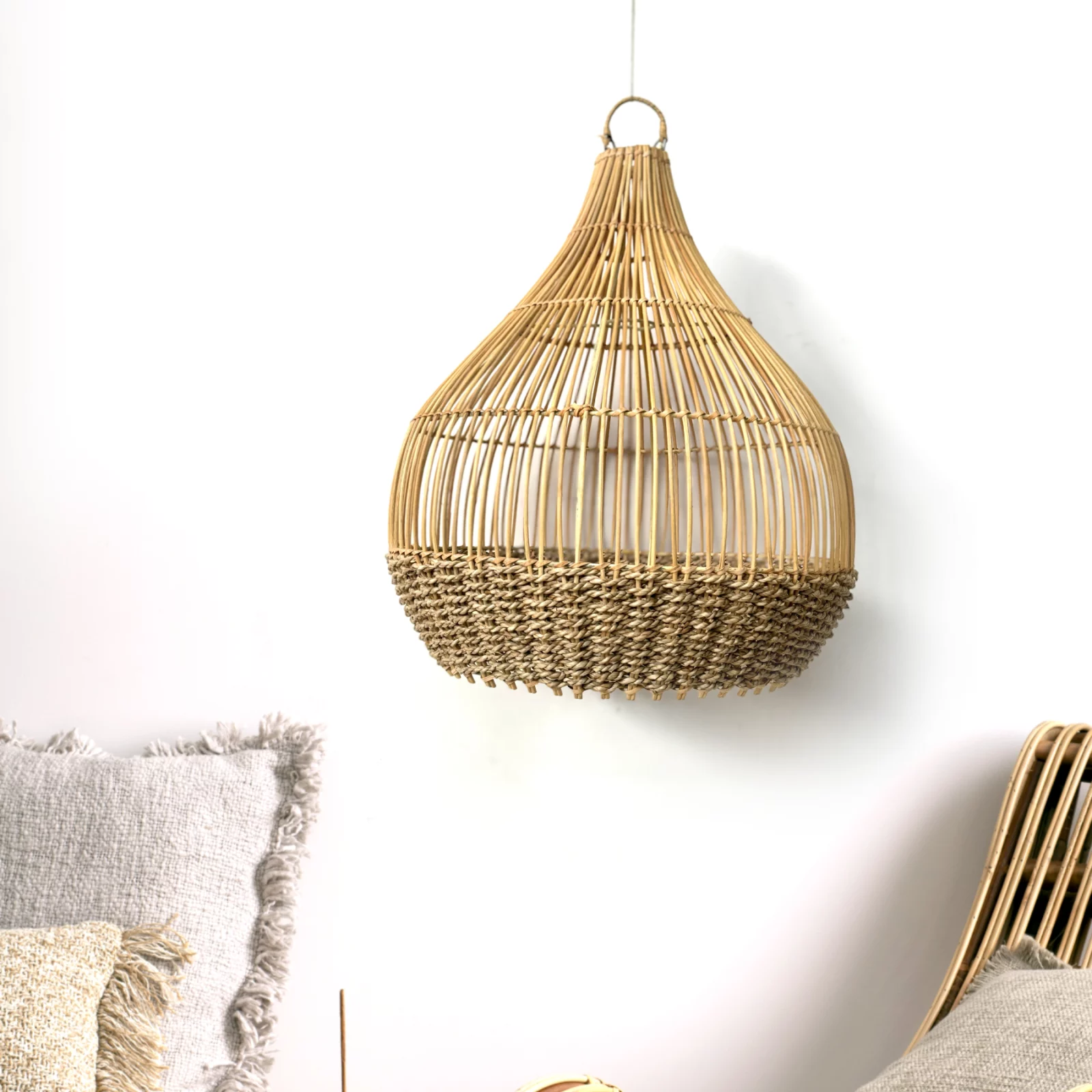Lámpara colgante hecha con materiales naturales.