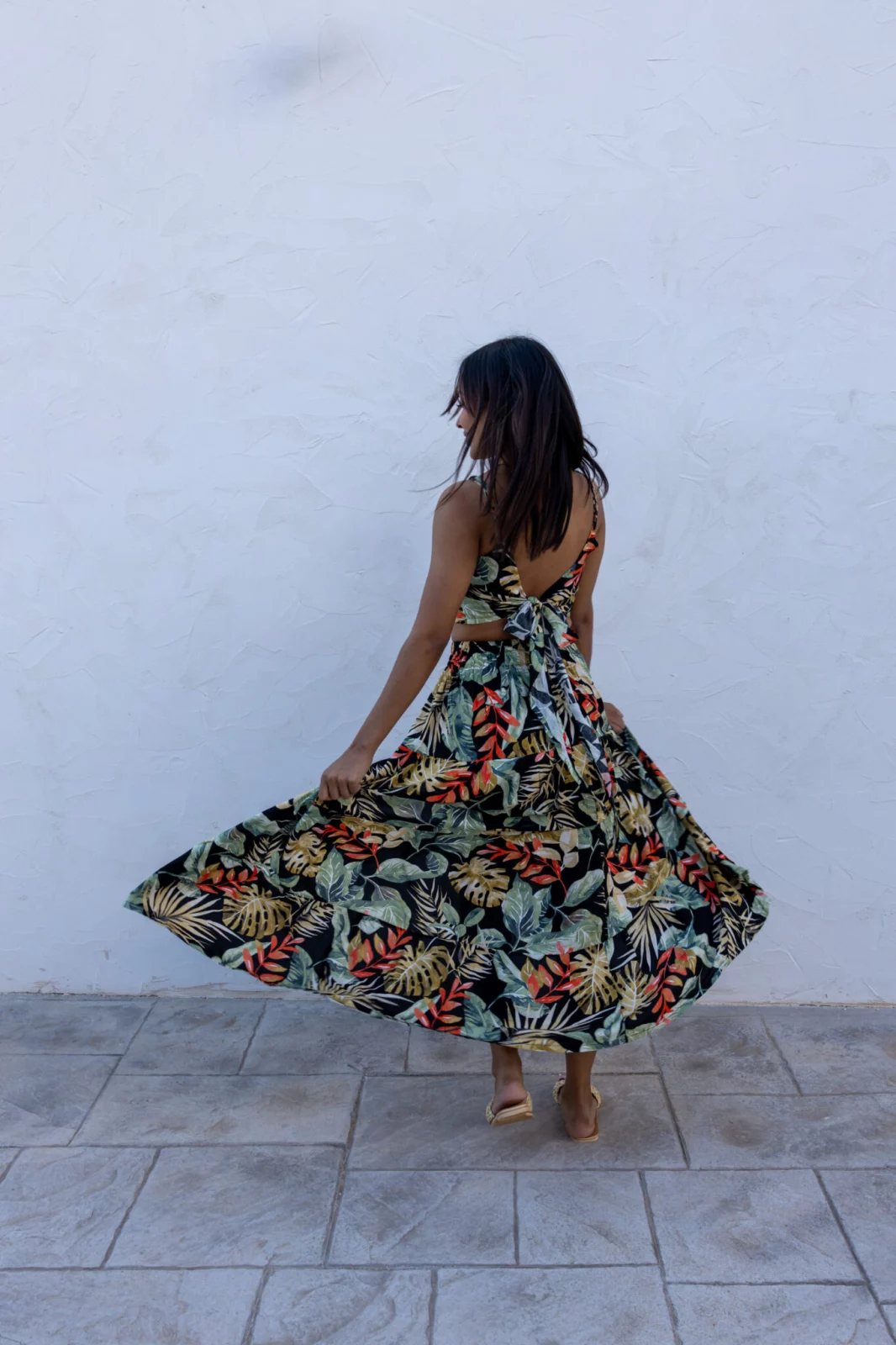 El top tipo crop tiene escote en pico, tirantes finos ajustables y un corte que realza la figura sin perder comodidad. La falda larga, ligera y fluida, incorpora una atrevida abertura lateral que deja entrever la pierna, aportando sensualidad y libertad de movimiento. Todo el conjunto está confeccionado en una tela suave y transpirable, con un vibrante estampado de hojas tropicales en tonos verdes, mostaza, coral y negro, que evoca paisajes exóticos y energía veraniega.