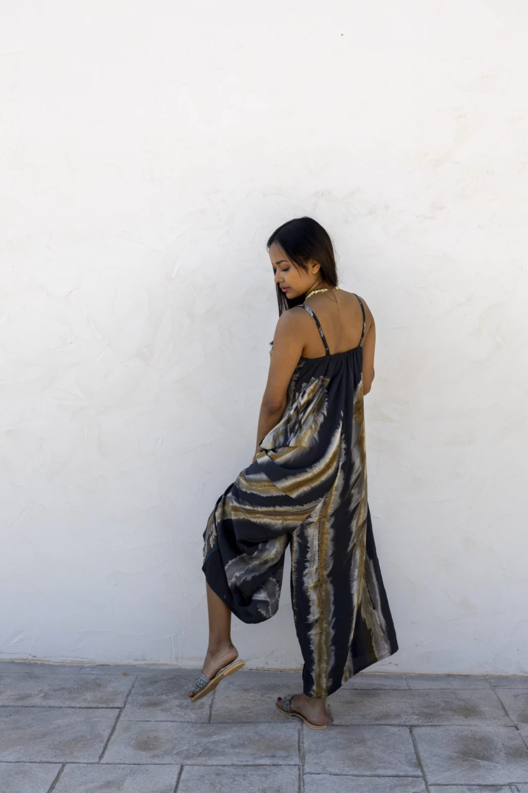 Este mono largo estilo palazzo es todo lo que necesitas para destacar sin renunciar a la comodidad. Su estampado tie-dye en tonos tierra y negro noche le da ese toque boho y relajado, ideal para quienes buscan un look veraniego con personalidad.