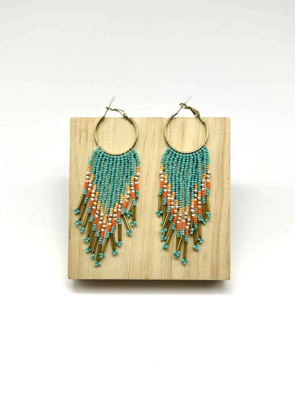 Pendientes forma de aro elegantes y refinados con flecos de color turquesa, naranja, blanco y dorado.