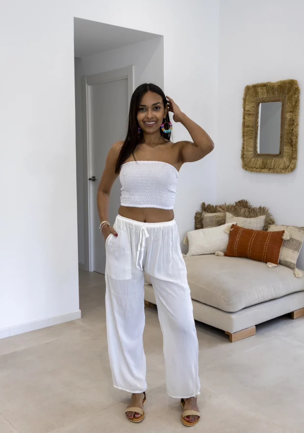 Este pantalón largo en color blanco es una pieza esencial para un look relajado con mucho estilo. Confeccionado en una tela ligera y de caída fluida, su diseño de pierna ancha y cintura elástica con cordón ajustable garantiza una comodidad absoluta durante todo el día. Tiene bolsillos laterales que no solo aportan practicidad, sino también un toque desenfadado que lo hace ideal para looks casuales, boho o incluso más urbanos según cómo lo combines.