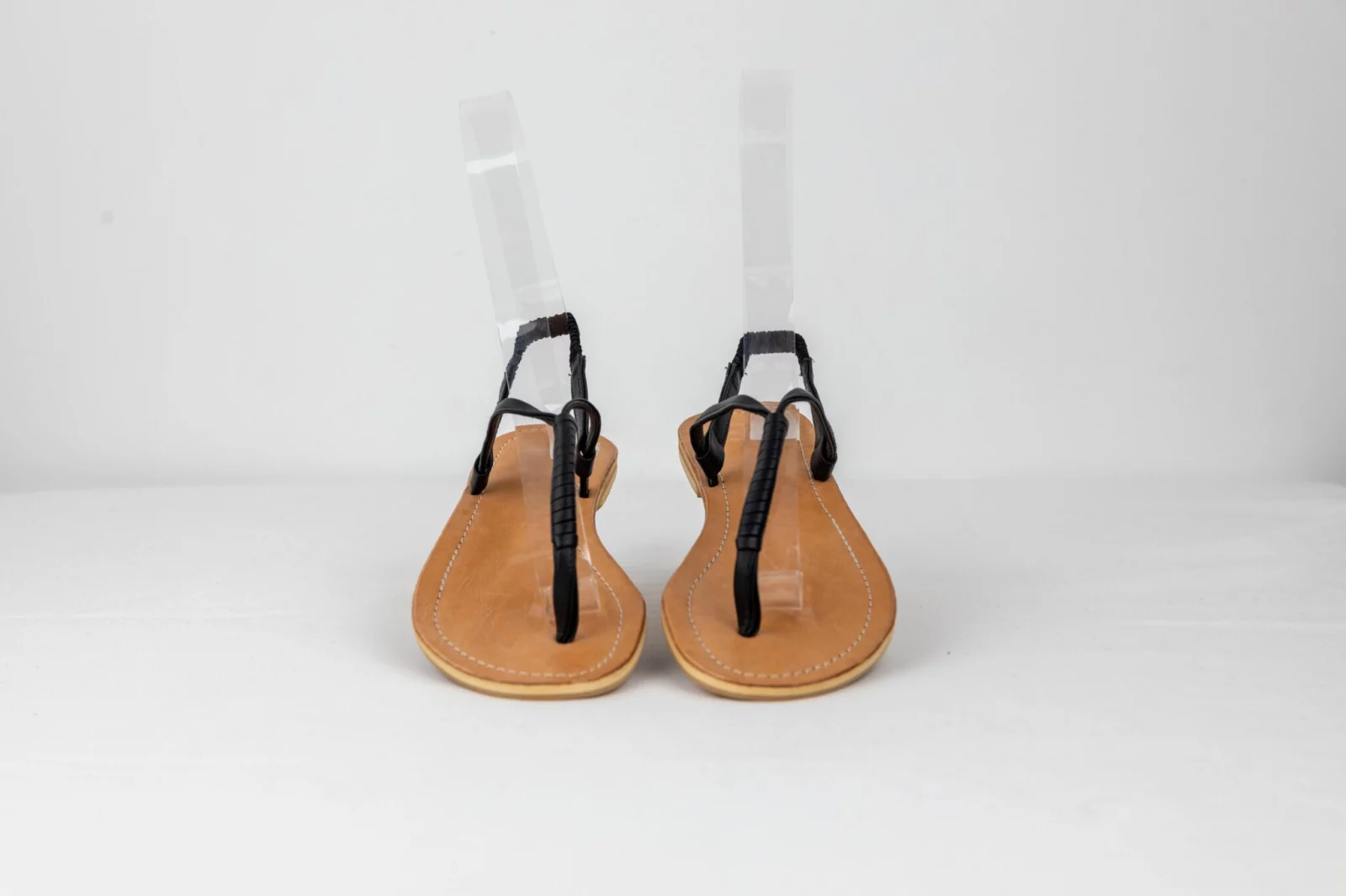 Estas sandalias minimalistas son el complemento perfecto para quienes buscan un diseño sencillo pero elegante. La parte superior está formada por tiras negras entrelazadas que aportan un toque de sofisticación, mientras que la base de cuero suave asegura una comodidad excepcional. La suela plana y flexible permite caminar durante todo el día sin sacrificar el confort, lo que las convierte en una opción ideal para el día a día. El diseño de las tiras es versátil, lo que las hace fáciles de combinar con una variedad de atuendos, desde vestidos casuales hasta pantalones cortos o faldas. Son la elección perfecta para un estilo relajado y chic, ideal para los días cálidos de verano.