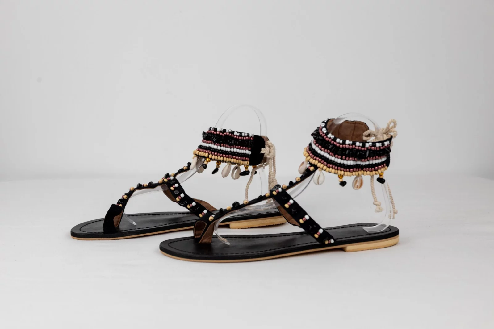 Sandalias bohemias con cuentas multicolores, conchas naturales y tiras de gamuza. Perfectas para un look veraniego vibrante y chic.