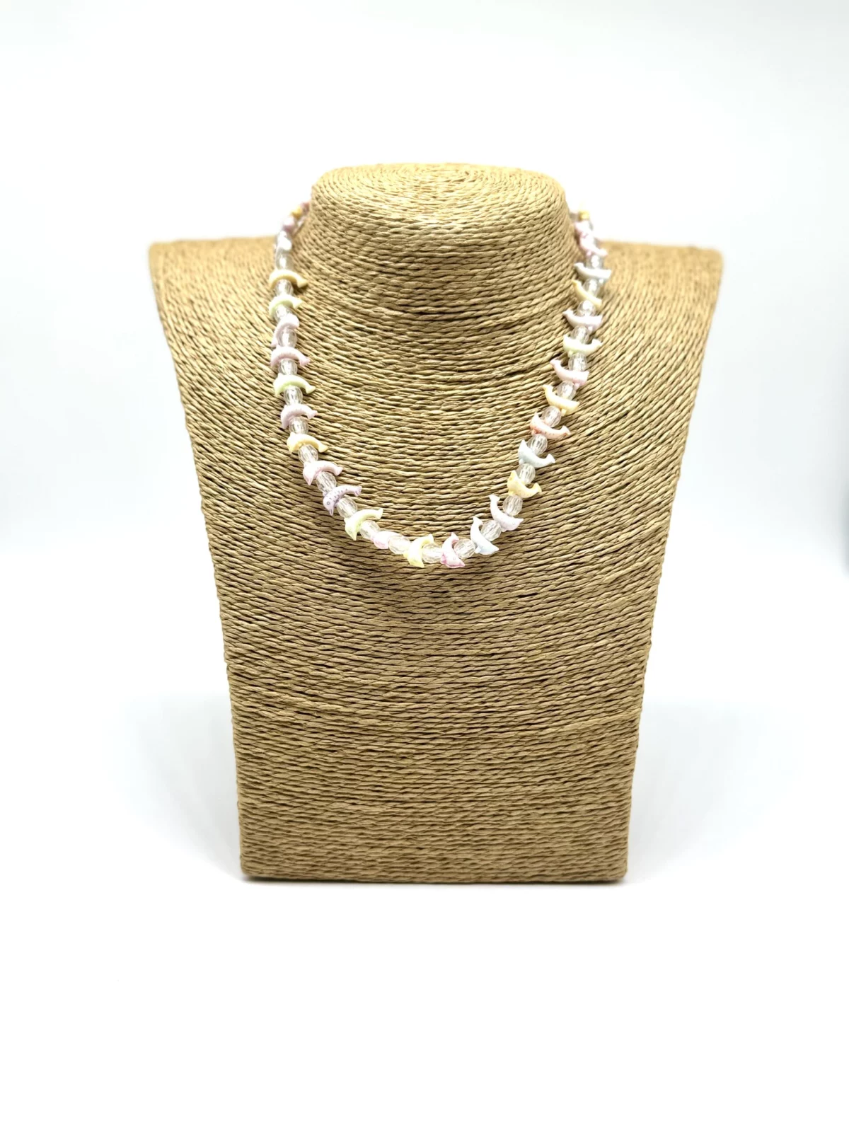 Collar blanco con delfines de colores.